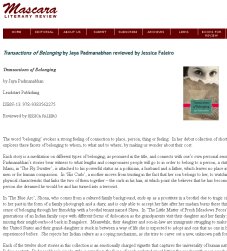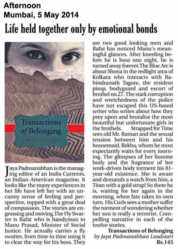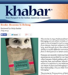 Q & A with Local Author Jaya Padmanabhan By Anita Felicelli, Apr 26, 2014 http://paloaltoonline.com/blogs/p/2014 /04/26/q--a-with-jaya-padmanabhan Jaya Padmanabhan's debut short story collection Transactions of Belonging was published by Leadstart Publishing yesterday. I met Jaya when we took a fiction workshop together in 2009 and was immediately impressed with her talent. The stories she submitted were intense, powerful and memorable. Jaya is the managing editor of the widely circulated Indian-American magazine India Currents (in the interests of fair disclosure: I contribute to India Currents). She is also a generous and observant nonfiction writer. Novelist Chitra Divakaruni noted the diverse cast of characters in Jaya's collection, writing, "With meticulous details and keen observation, she brings them to life and makes us care about them - their poverty, their loneliness, their tragedies and their triumphs." Jaya will read from Transactions of Belonging on May 11, 2014 at 4 p.m. at Know Knew Books. Transactions of Belonging is an evocative title. Are the stories in your collection organized around the theme of belonging? Yes, in this collection I tried to examine the give and take of belonging—the transactions we enter into, the compromises we make, the filters we use to justify our beliefs. In one of the stories-"The Blue Arc"-a woman trapped in the brothels of Calcutta cultivates a relationship with a neighbor as her reason to belong. In another one, a young boy searches the reason for his alienation. The emotional ups and downs in the stories are part of the journey that I take the reader on. When I hear the title of your collection, I not only think of belonging, but also the things that stand in the way of belonging-displacement or dislocation. Where do these stories take place? Great question. True, many are about displacement. Characters in the collection find themselves in unfamiliar locales and novel relationships. I have tried to get at how we as individuals attempt to interpret our encounters to shape our experiences. The geographic boundaries that the characters inhabit are incidental. Some are in India and some are in the U.S. The story "His Curls" is free of geographical boundaries and hence can be placed or displaced anywhere. When did you start working on this collection? Also, related, you've worked in many different capacities - have any of your day jobs influenced your work? I've worked on the collection for over three years. Each one of my jobs exposed me to untold stories and narratives waiting to be written. I have always been a writer-in-waiting and all these other jobs, whether as a mother, a collections agent or as a software engineer, presented a worldview, a perspective, that I would never have been privy to otherwise. Do you have a favorite story in the collection? What is it about? I think I'd like to answer that by talking about the story I had the most tumultuous relationship with. The story "His Curls" is the first short story I wrote and I spent over three years debating what the ending should be. Finally I left it ambiguous. The story is about a mother who suspects her son is a terrorist. The story's ending can be shaped depending on how the reader views the world around him/her. Finally, I found that the ending settled into place as an engagement with the reader. Agonizing about the story taught me that every story did not need to be tied into a neat knot. The beginning, ending and even the middle can be as troubling as the interior world the characters inhabit. Which authors do you see as influences for your fiction writing? This is one of the most complicated questions to answer. I have favorite writers for different moods. I like Rohinton Mistry for his compassionate voice; V.S. Naipaul for his brilliant modulation; Toni Morrison for her spare, stark prose; J.D. Salinger for the timelessness of his tale; Margaret Atwood for her inventiveness; Vladimir Nabokov for writing the most startlingly perfect multi-dimensional novel: Pale Fire, and the list goes on. Has your work with India Currents first as a writer and later as managing editor impacted the kinds of stories you're interested in telling? Working for a magazine like India Currents has taught me the beauty of moderation and the power of interrogation. It's been an incredible learning experience. Mostly, I am humbled by the talent I've encountered, the beautiful voices I've worked with, including this interviewer's. The stories I'd like to tell today are the ones I encounter in my everyday, the environment I live, love and work in. Are you working on anything new? I'm working on a novel titled The Eleventh Letter. It's been in the works for close to four years. It has some of the characters that you'll meet in one of the short stories. |